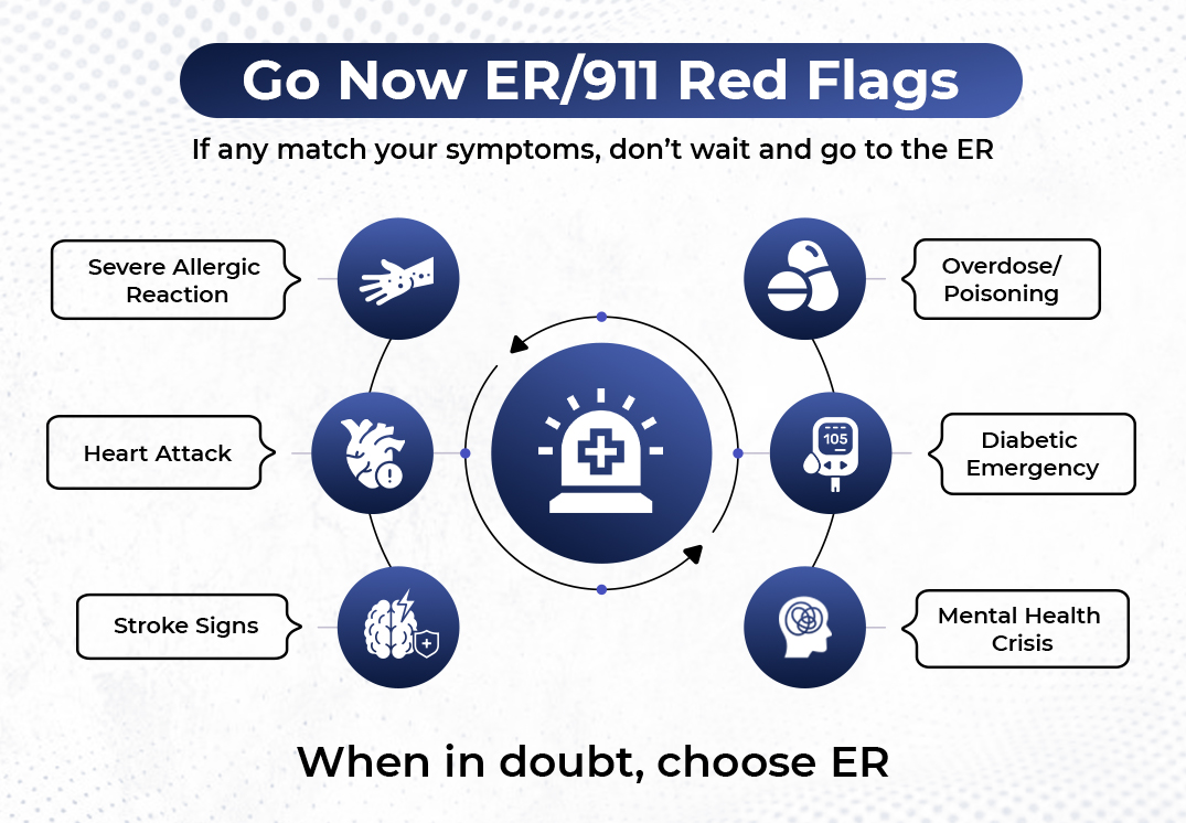 - Go to the Emergency Room (ER) when symptoms are sudden, intense, or getting worse fast, or when waiting isn’t felt safe. If it’s truly urgent and you’re unsure, call 911.
