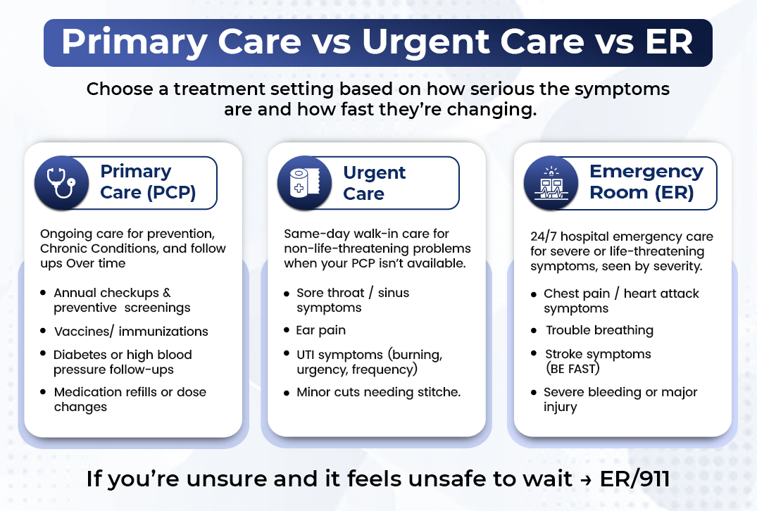 Urgent care when you can’t wait for an appointment, but you’re not in danger (same-day illness or minor injury). - If symptoms worsen quickly or you feel something is seriously wrong, skip the “wait and see” and go to the ER.