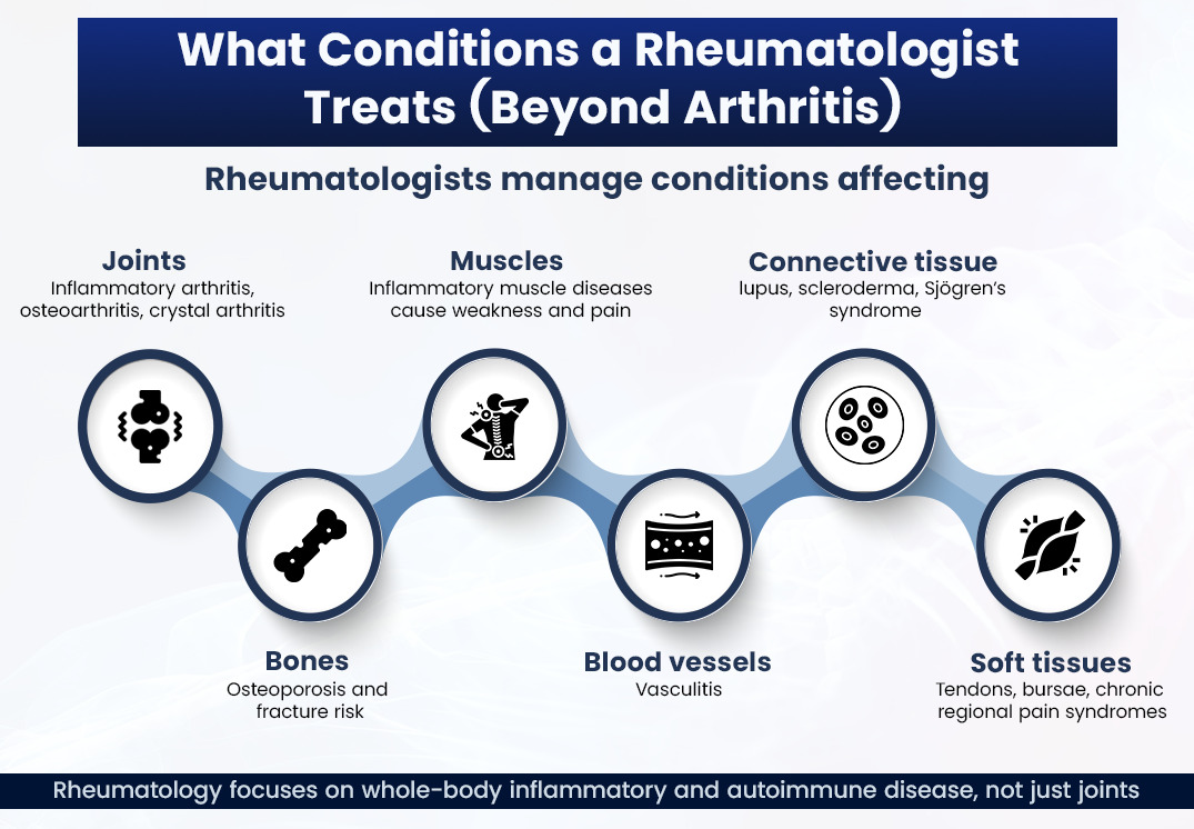 While “arthritis” is the most familiar category, rheumatology also covers systemic disorders that may affect the skin, lungs, kidneys & blood vessels. A rheumatology specialist evaluates, diagnoses, and manages these complex conditions using medical (non-surgical) strategies.